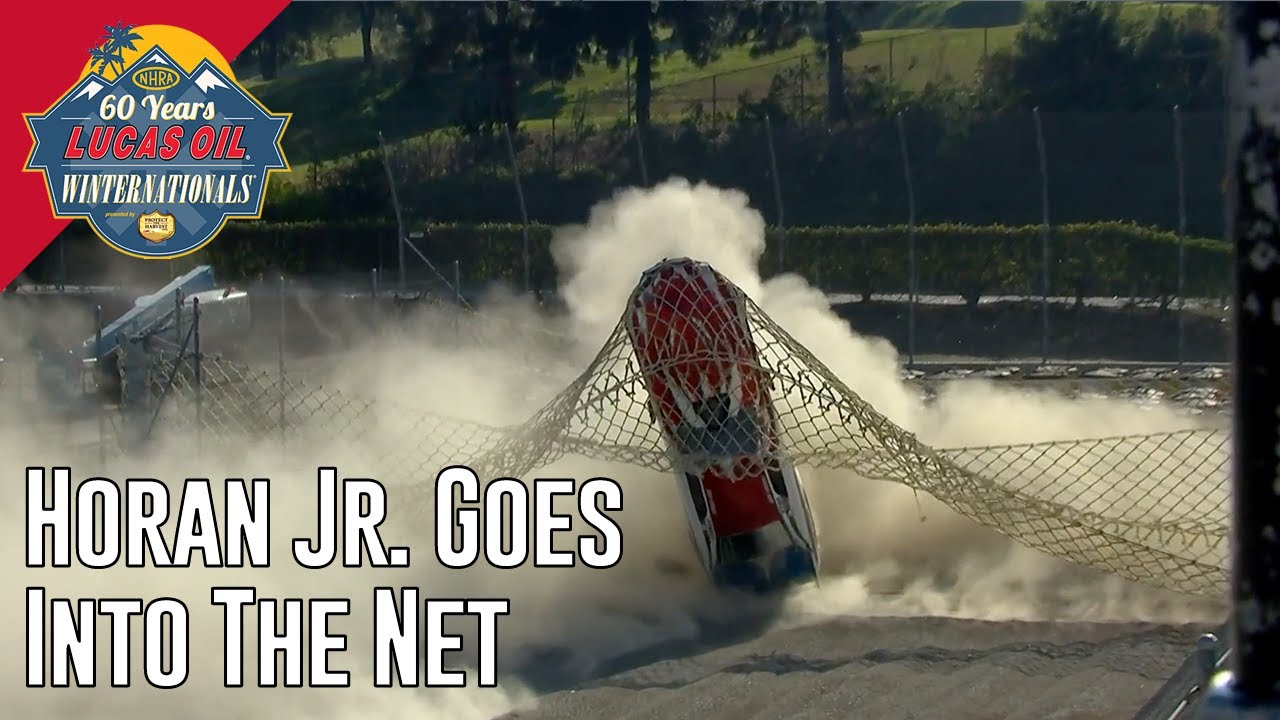 Nostalgia Funny Car driver Dan Horan Jr. suffered a crash during Friday qualifying . Horan's chutes failed to deploy and went into the sand and net. Horan was not injured. Facebook: